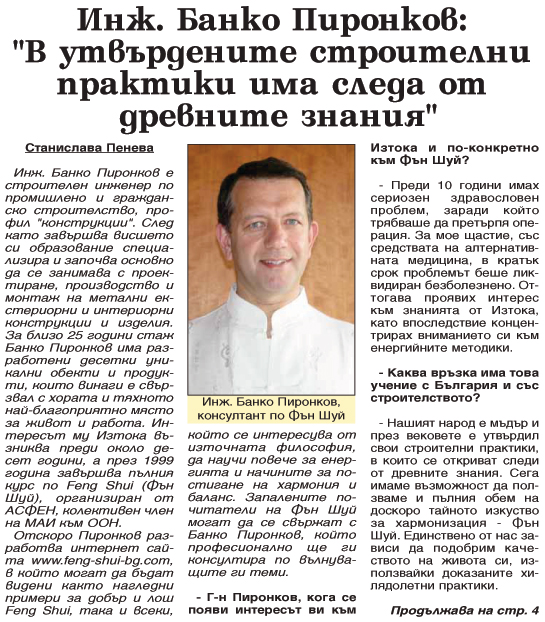 - Г-н Пиронков, кога се появи интересът ви към Изтока и по-конкретно към Фън Шуй?