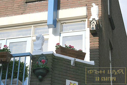 Фигура на орел до ръба на стената, фигура на лъв с щит на перваза на балкона, барелеф на лъвска глава на парапета над бронзовата саксия – всички са сложени на неподходящо място и в неправилно съчетание.