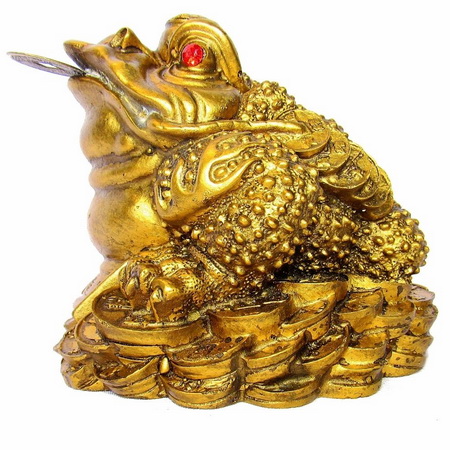 Фън Шуй - богато декорирана статуетка - пластика от полирезин, декоративна фигура на Трикраката жаба на Парите и Късмета, един от най-ефективните и най-известни талисмани - символи на Фън Шуй. Жабата е трикрака, с паричка в уста и е стъпила върху купчина монети. Този талисман притежава изключителна сила да привлича Богатството към притежателя си. Поставете я в югоизточният сектор на дома или на бюрото в офиса. Можете да я поставите на малка масичка срещу входната врата, но не директно, а под малък ъгъл и резултатите няма да закъснеят. Не я поставяйте директно на земята! Въпреки, че в устата си жабата има китайска паричка, за предпочитане е да сложите там и българска монета.Не пестете средства за покупка на жаба - тя трябва да изглежда изящно и скъпо - тя е символ на Вашето Богатство.