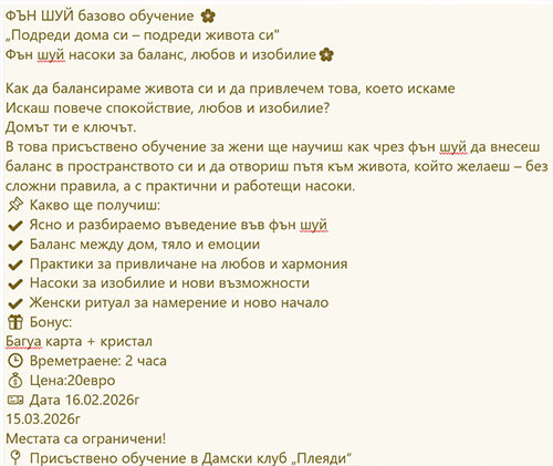 Когато аз правя курс за базово ниво, само обяснението на основните понятия във Фън Шуй отнема един ден, дори съм имал случай да говоря 12 часа с отговори на въпроси и обсъждане на примери. В рекламираното обучение не знам какво ще дадат за два часа с толкова богата и разнообразна програма. Резултатът е предизвестен – малко общи приказки, няколко практически насоки, които могат да се извадят от интернет и така участничките ще останат с впечатление, че това древно китайско учение може да се изучи набързо за половин час. Добър ориентир е и цената – за 10 € на час получаваш хилядолетни знания!!!