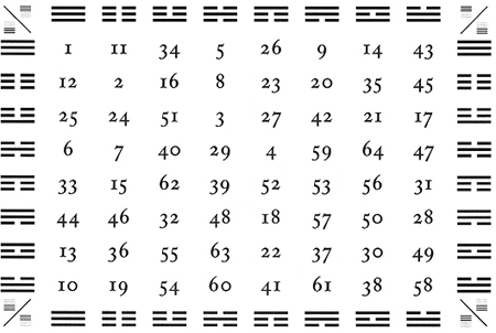 Ето така изглежда таблицата с хексаграмите – позицията на всяка хексаграма се определя от комбинацията на изграждащите я триграми.