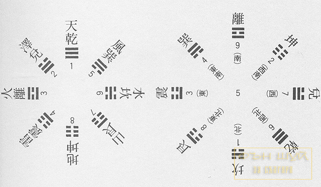 Вляво – Ба Гуа на Ранното небе (цифрите съответстват на триграмите по реда на възникването им), вдясно – Ба Гуа на Късното небе с цифрите от Луо Шу