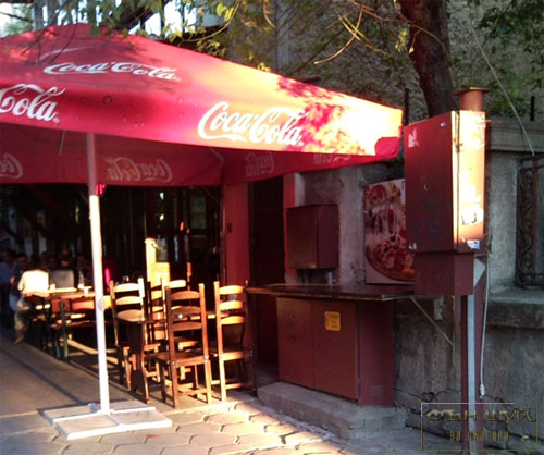 В това заведение доверчивите клиенти имат възможност да изберат място за отмора под чадъра на плота, монтиран върху електрическата касета с надпис „Опасно за живота”, като допълнително ще бъдат облъчени от електрическите табла от двете страни на касетата. В същото неблагоприятно положение ще бъдат и седящите на най-близката маса.