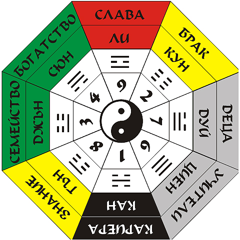 Посоките на света са без значение. Отпада необходимостта да се проверява всяка вещ или положение на хората с компас, както е в компасните школи. Този начин на използване на схемата е в съзвучие с принципа на Четирите защитника (Четирите защитни животни) и отчита реалната обстановка, влизането и движението на ци в обекта заедно с хората.